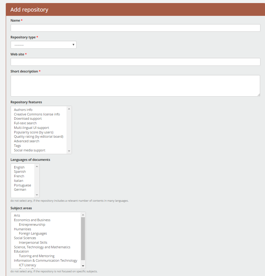 • languages: the language or the languages corresponding to a substantial number of contents; no selection means that the repository includes OERs in almost any language: this is ok for Youtube, Vimeo aso